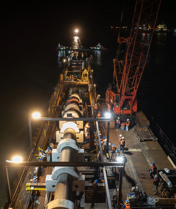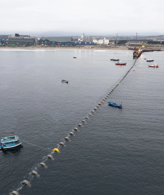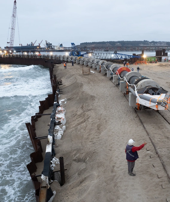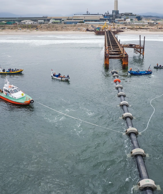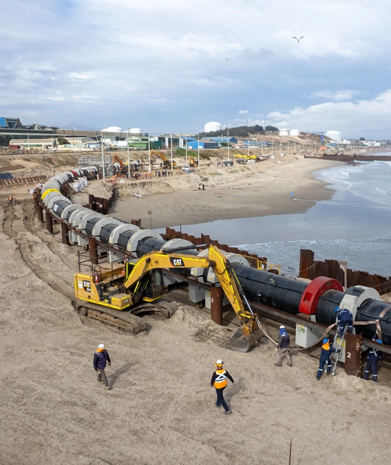 La captación corresponde a una tubería de diámetro 1.800 mm, largo 1.100 metros y peso de 1.750 toneladas. La descarga corresponde a una tubería de diámetro 1.200 mm, largo 713 metros y peso de 1.180 toneladas. Se ejecutaron también las obras terrestres de conexión.