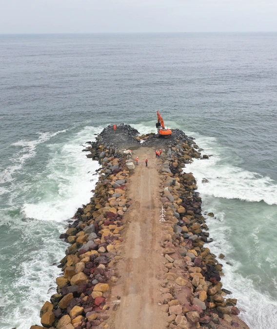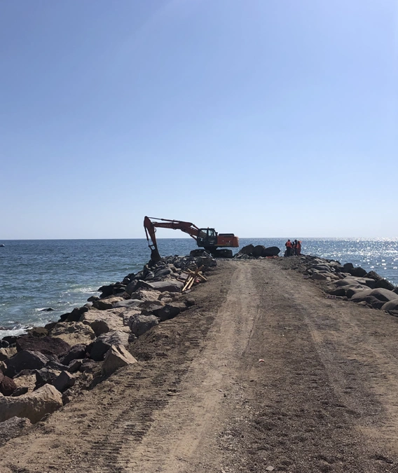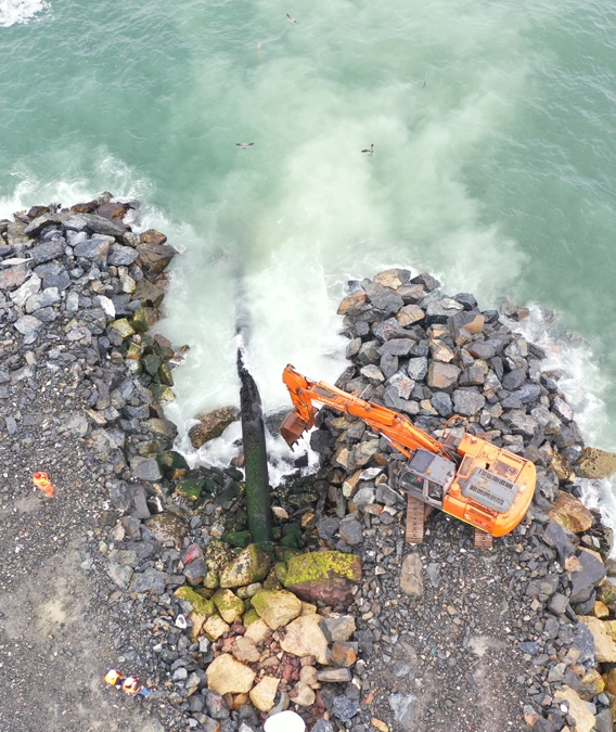 El proyecto construido por Conix permitió dar seguridad a la obra, reponiendo el lastrado de la tubería por medio de mantas de hormigón Synthetex, protegiendo el ducto mediante cubiertas prefabricadas de hormigón y ejecutando un nuevo cabezo del enrocado con rocas de 7 ton.